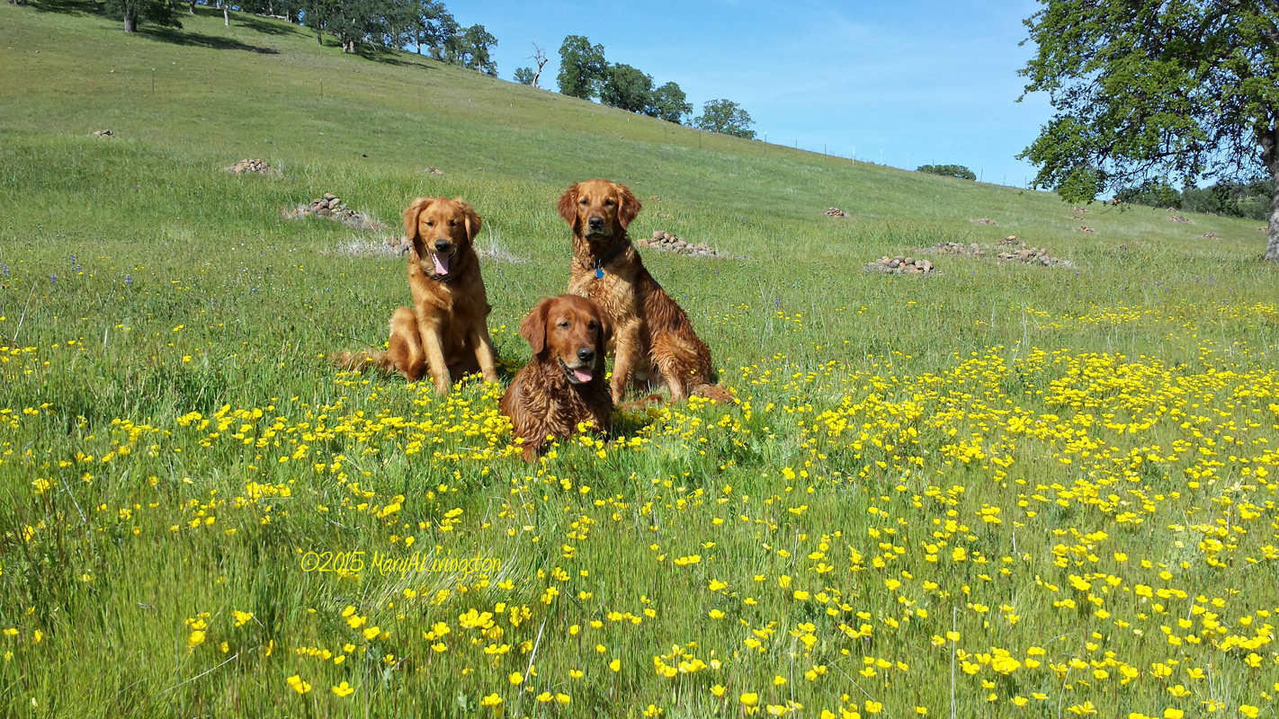 A nice shot of Blitz (front) with Kinta and Sailor in the spring buttercups.