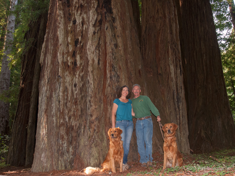 At the base of a Coastal Redwood tree. L-R: Kinta Mary, Tim, Sailor